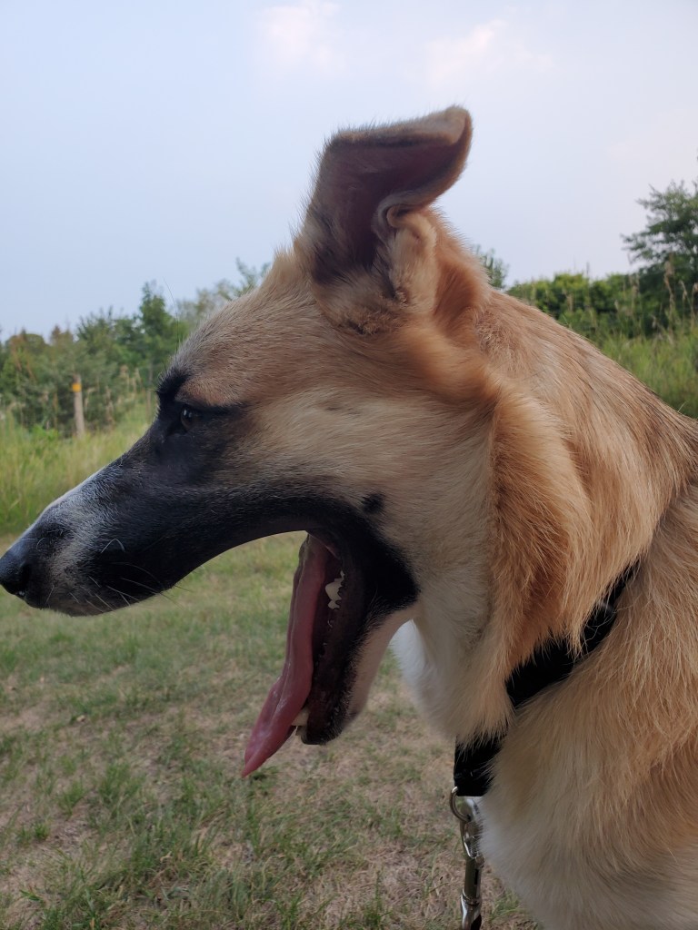 Some things really stress Junko out. When she’s having more fun than she knows how to express and suddenly hears the words “Gentle–no bite!” When we won’t let her hunt the backyard bunnies. Or when, despite her curious, sweet puppy-dog-eyes, we finish the last of our human-food without sharing. When these things happen, Junko does a BIG yawn or a floppy shake-off, and then she feels better.