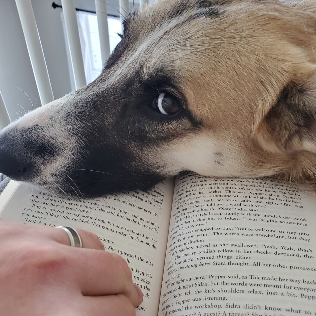 Some things really stress Junko out. When she’s having more fun than she knows how to express and suddenly hears the words “Gentle–no bite!” When we won’t let her hunt the backyard bunnies. Or when, despite her curious, sweet puppy-dog-eyes, we finish the last of our human-food without sharing. When these things happen, Junko does a BIG yawn or a floppy shake-off, and then she feels better.